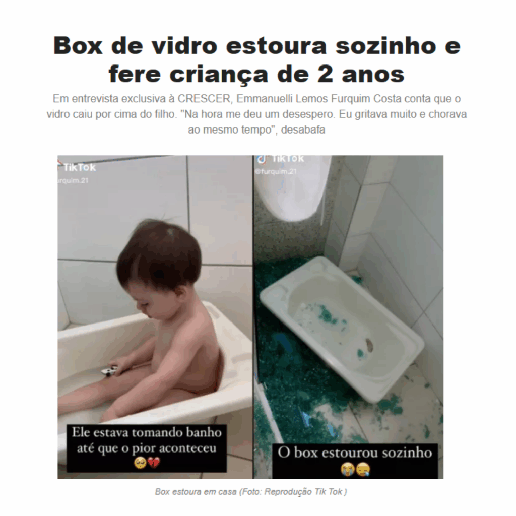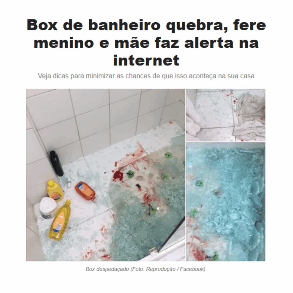 O box do banheiro é um dos maiores causadores de acidentes domésticos, pois vidros comuns podem explodir com mudanças bruscas de temperatura ou impacto, e as roldanas sem manutenção podem causar acidentes por desgaste ou desencaixe do box.