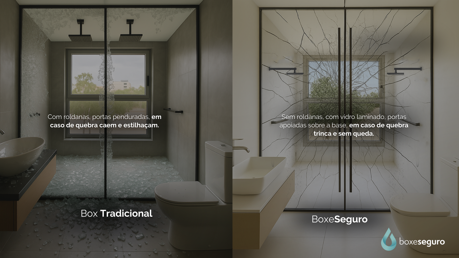 Com o BoxeSeguro este risco é nulo, pois usa-se o vidro laminado, a película de PVB entre as lâminas do vidro eliminam este problema. Uma coisa que chamou atenção foi o fato de não existirem roldanas que se desgastam com o tempo. Pretendo trocar também nos outros banheiros da casa. Cem por cento aprovado.